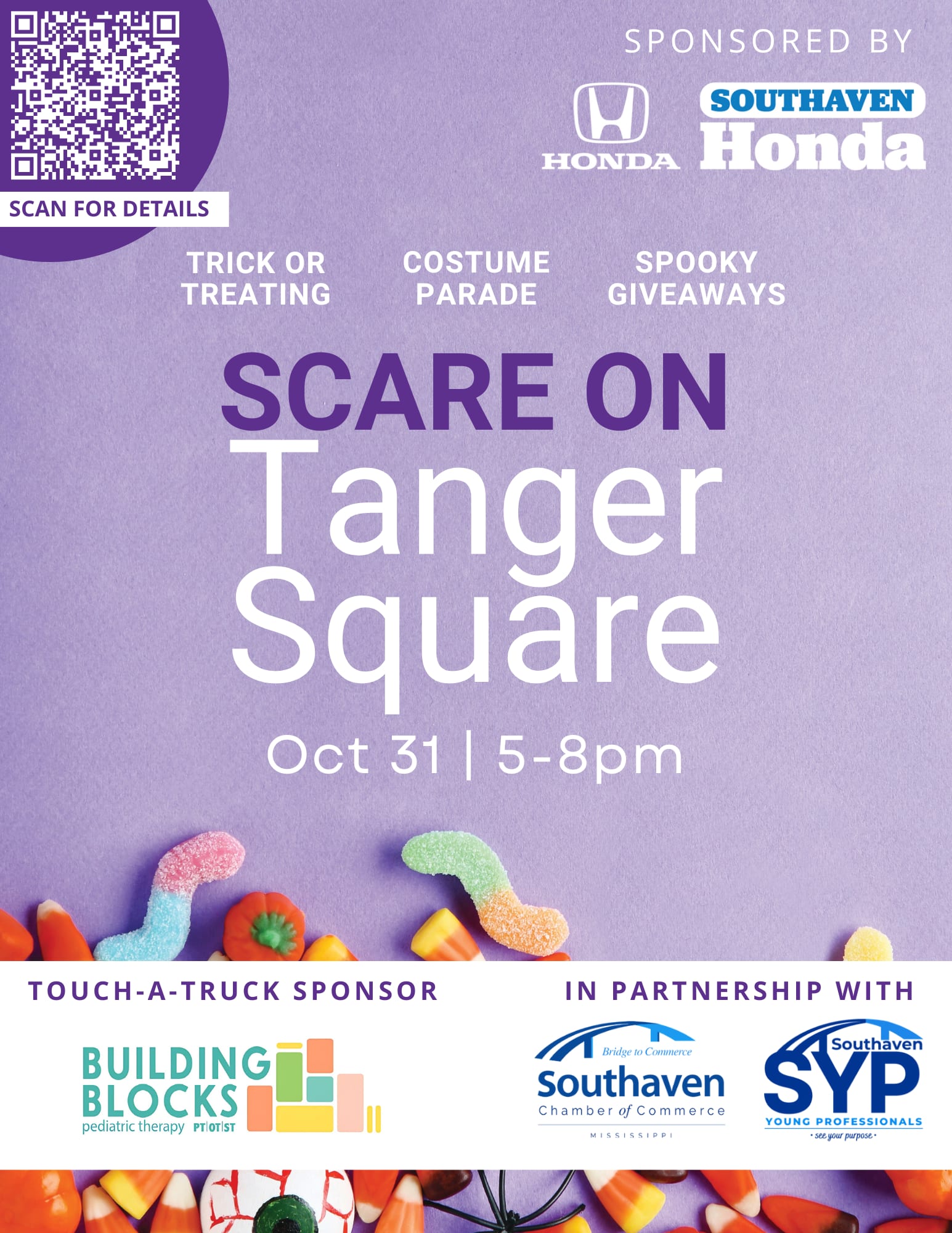 Scare on the Tanger Square, October 31, 2025 5:00 PM – 8:00 PM, Tanger Outlets 5205 Airways Blvd. Southaven, MS 38671 On October 31st Tanger Outlets Southaven/Memphis, Southaven Chamber of Commerce, and Southaven Young Professionals are excited to once again host the FREE Family Fun Trunk-Or-Treat event, "Southaven Scare on the Tanger Square" in Silo Square presented by Southaven Honda. This event has been lauded as the largest FREE community event last year for DeSoto County families. Come in costume and be prepared to have festive fun with the entire family that will feature a variety of festive activities, including candy/treat giveaways, face painting, pumpkin decorating, games, Touch-A-Truck activations, and more. Want to join the action? Companies, organizations, and families may help by decorating a trunk and passing out candy to attendees. 'Trunkers' can purchase a parking spot.. There will also be a contest for the best-decorated trunk. Deadline to register for a spot is October 29, 2025. Trunkers are asked to anticipate thousands of kids, which means tons of candy. So you are more than welcome to be innovative with activation activities for the kids! If you'd like to sign up your trunk, please. Contact the Southaven Chamber office. info@southavenchamber.com